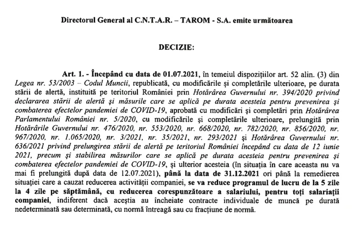 Toți salariații TAROM, indiferent de tipul contractelor de muncă, vor lucra, începând de joi, 1 iulie, timp de patru zile pe săptămână, iar salariul le va fi redus corespunzător, conform deciziei directoului general al companiei.