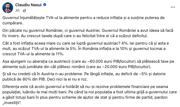 „Austriecii, cu un PIB pe cap de locuitor de aproximativ 60.000 de euro, plătesc taxe pe alimente sub jumătate din cât plătesc românii, cu un PIB de ~20.000 euro. Guvernul României pare să-și prioritizeze reducerile de deficit și schemele de ajutor de stat pentru firme de partid în detrimentul populației”, spune Claudiu Năsui.