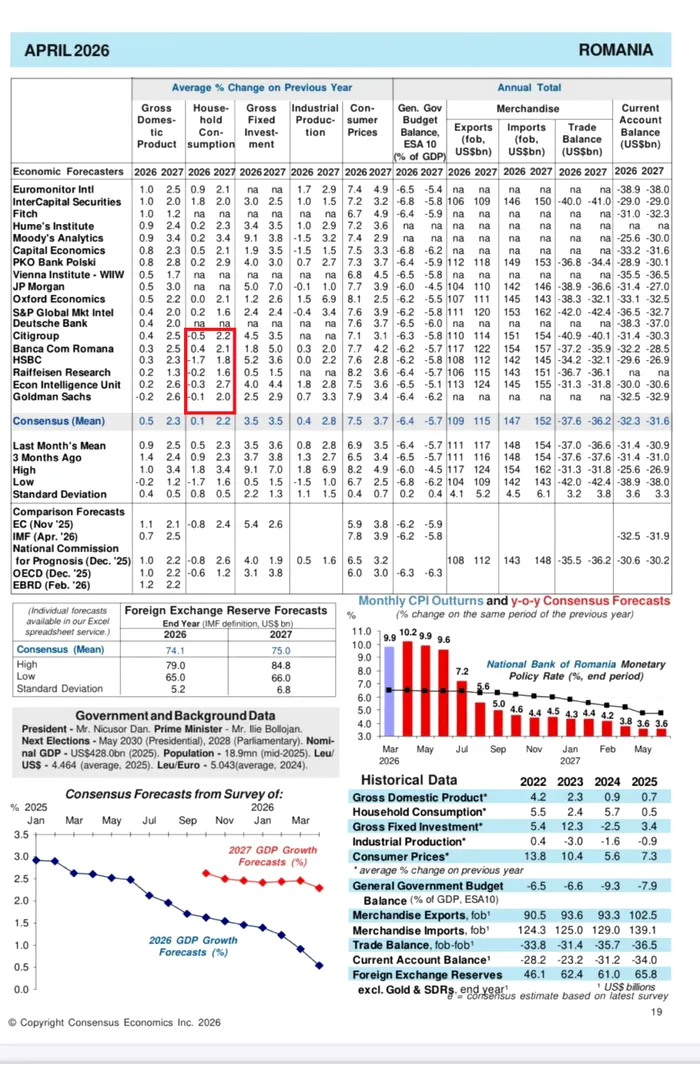 Potrivit datelor din raportul Consensus Economics, media prognozelor de creștere a PIB-ului României în 2026 a scăzut la 0,5% de la 0,9% luna precedentă și 1,4% în urmă cu trei luni. Scăderea prognozei medii pentru 2026 arată că economia României este văzută de către analiști la limita stagnării sau chiar în recesiune.