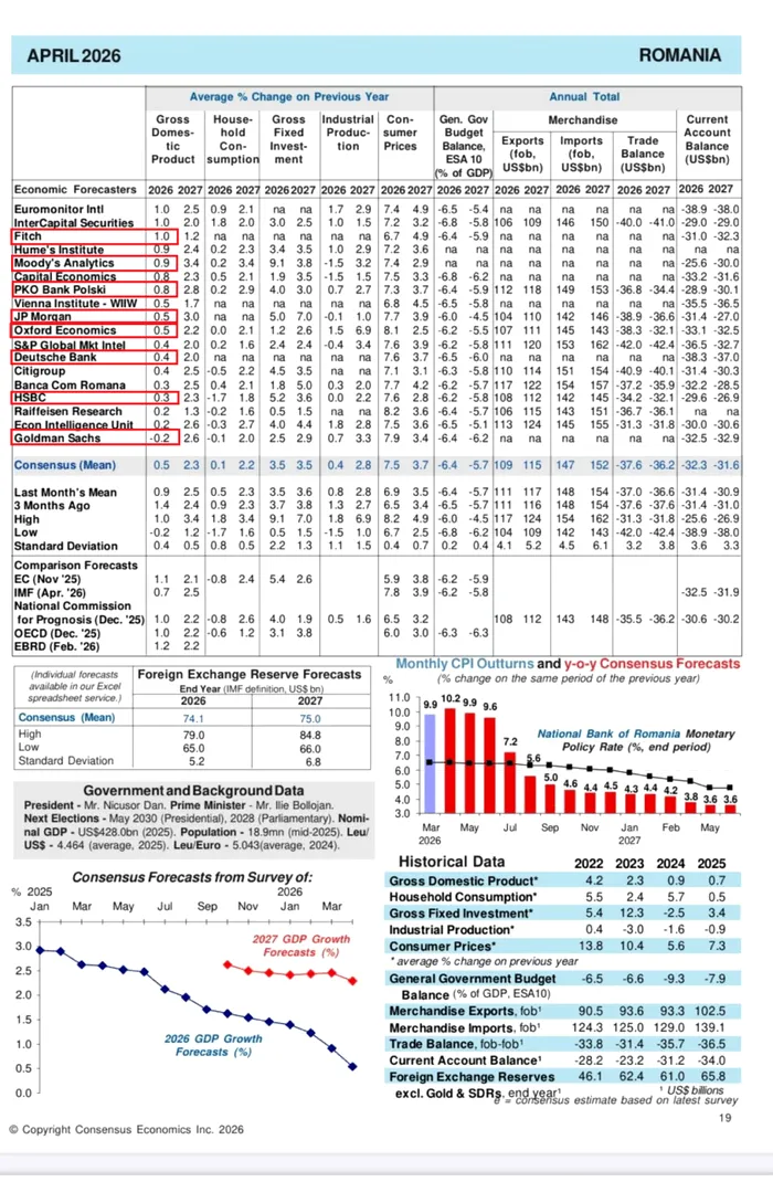 Cele mai mari instituții bancare din lume devin din ce în ce mai pesimiste cu privire la economia României. Gigantul american Goldman Sachs vede chiar o scădere economică. Prognozele Consensus ale băncilor și instituțiilor internaționale din luna aprilie arată o înrăutățire a perspectivelor economice ale României, cu o creștere economică aproape de stagnare, inflație ridicată și dezechilibre externe.