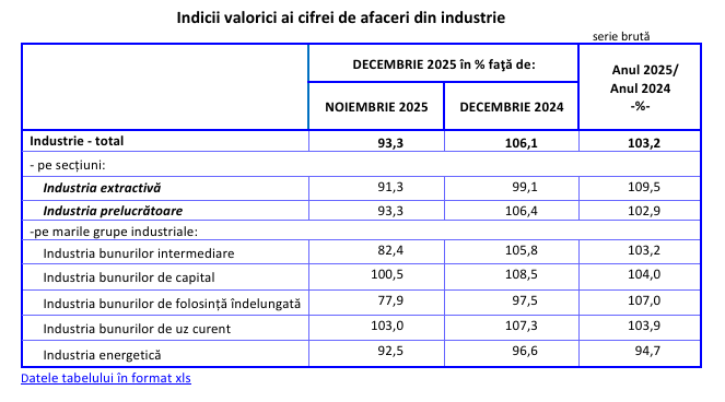 Cifra de afaceri din industrie, în termeni nominali, în luna decembrie 2025 comparativ cu luna precedentă, a scăzut per total cu 6,7%, arată datele INS. Cauza o reprezintă scăderile înregistrate în industria extractivă, -8,7% și în industria prelucrătoare, -6,7%. Pe marile grupe industriale, industria bunurilor de folosință îndelungată a înregistrat scăderi de 22,1%, industria bunurilor intermediare, 17,6% și industria energetică, scăderi de 7,5%. Creșteri au fost înregistrate la industria bunurilor de uz curent, 3,0% și la industria bunurilor de capital, 0,5%.