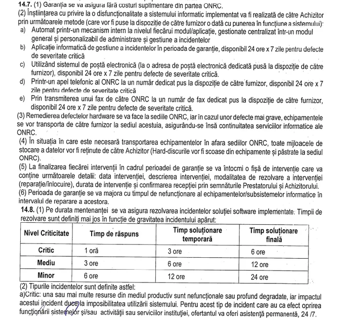Contractul-cadru consultat de Gândul arată termenele clare pentru remedierea probelemelor apărute în perioada de garanție, care sunt în responsabilitatea presatorilor contractați.