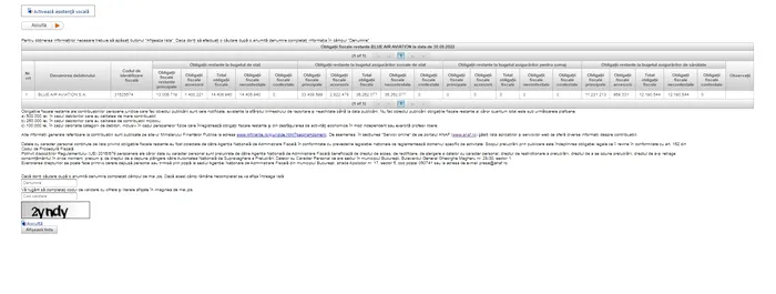 Conform fișei sintetice citate, Blue Air Aviation are obligații de plată în sumă totală de 402,52 milioane lei, astfel: 66.595.172 lei reprezentând obligații fiscale; suma de 335.922.172 lei reprezentând ajutor de stat și ajutor de salvare acordat în 2020, ca urmare a dificultăților prin care a trecut operatorul aviatic din cauza restricțiilor impuse pentru gestionarea pandemiei de COVID-19.