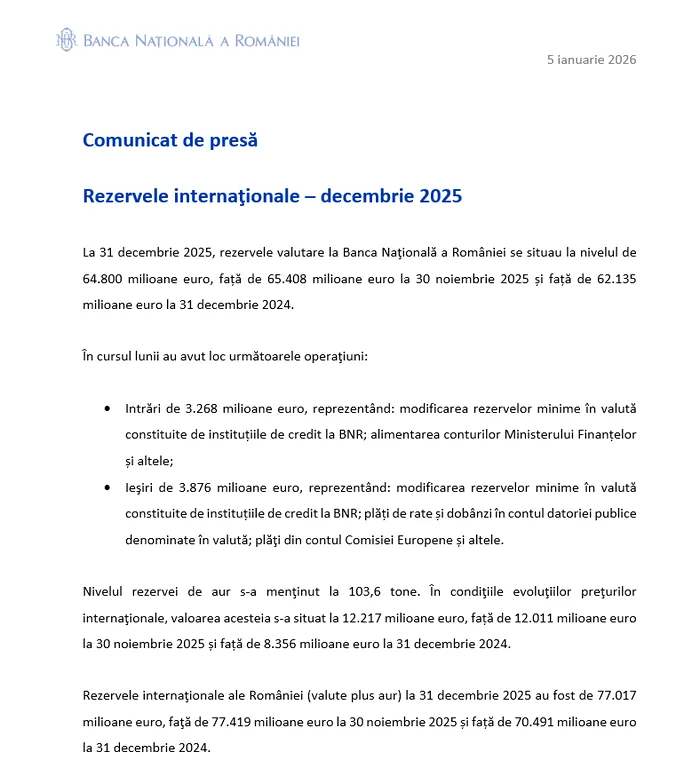 Rezervele internaționale ale României la finalul anului trecut au fost de 77,01 miliarde de euro, față de 77,4 miliarde de euro la 30 noiembrie 2025 și față de 70,4 miliarde de euro la sfârșitul anului 2024. De asemenea, nivelul rezervei de aur s-a menținut la 103,6 tone și, în condițiile evoluțiilor prețurilor internaționale, valoarea ei s-a situat la 12,2 miliarde de euro, față de 12,011 milioane de euro la 30 noiembrie 2025 și față de 8,356 miliarde de euro la finalul anului 2024. De asemenea, plățile scadente în ianuarie 2026 în contul datoriei publice denominate în valută, directe sau garantate de Ministerul Finanțelor au o valoare de aproximativ 389 milioane de euro.