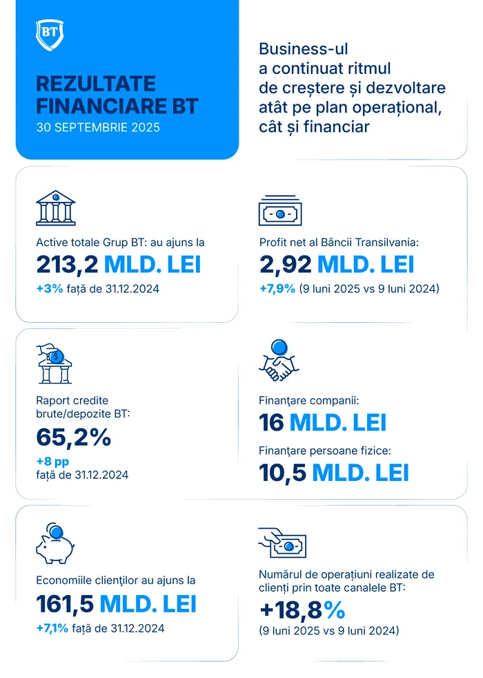 Grupul financiar a ajuns la active totale de 213,2 mld. lei, o creștere de 3% față de finalul anului trecuti și aproape 7% peste nivelul din septebmrie 2024. De asemenea, creditele și creanțele din leasing nete au urcat la 104,2 mld. lei, cu un avans de 8,1% față de începutul anului și de 10,7% față de septembrie 2024. Veniturile operaționale au urmat trendul ascendent, astfel că venitul net din dobânzi a crescut cu 20,2% față de primele nouă luni din 2024, iar venitul net din taxe și comisioane a crescut cu 12,1%. Numărul de operațiuni realizate de persoanele fizice și companii a crescut cu aproximativ 19% față de 2024.