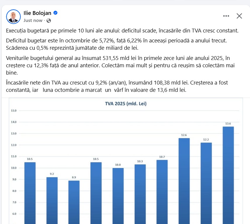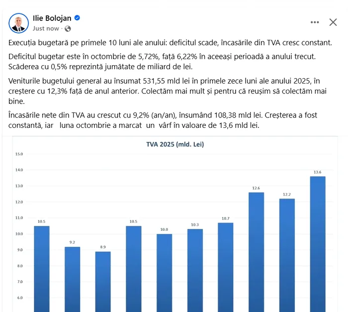 Încasările nete din TVA au crescut cu 9,2% (an/an), însumând 108,38 mld lei. Creșterea a fost constantă, iar luna octombrie a marcat un vârf în valoare de 13,6 mld lei”, a scris premierul Bolojan, joi, pe Facebook.