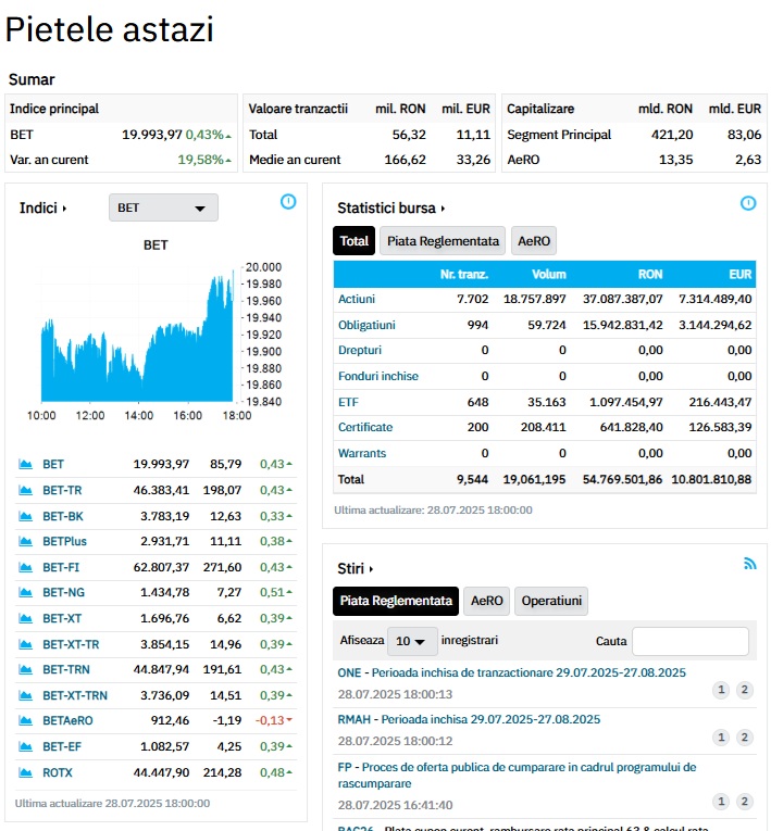 Bursa de Valori Bucureşti (BVB) a închis, luni, cu creșteri pe aproape toți indicii, cu o excepție, după ce deschise ședința de tranzacționare pe roșu pe majoritatea. După patru ședințe consecutive de creștere a principalului indice, Bucharest Exchange Trading (BET), se înregistrează un nou maxim istoric la închidere, de 19.993,97 de puncte, față de 19.908,18, vineri.