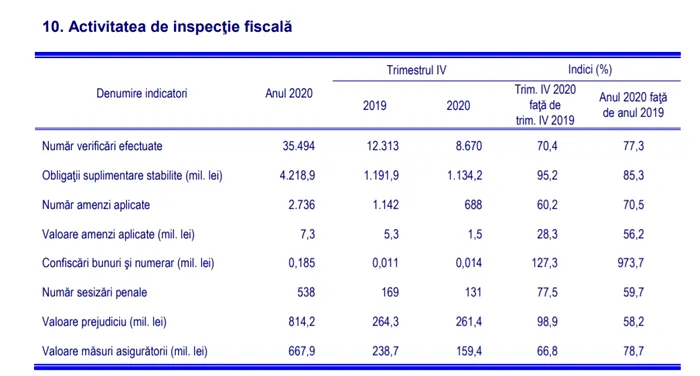 Inspectorii Autorității Naționale de Administrare Fiscală (ANAF) au stabilit anul trecut obligații suplimentare de aproximativ 860 de milioane de euro (4,2 miliarde de lei) după peste 35.000 de verificări efectuate. Numărul contribuabililor activi, persoane juridice și cu activități independente, în anul 2020 a fost de 1.772.170, conform buletinului statistic al instituției. Atât numărul verificărilor, cât și cuantumul total al sumelor reprezintă scăderi în raport cu cele din anul 2019.