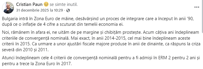 La rândul său, profesorul universitar Cristian Păun salută aderarea Bulgariei la euro, și opinează că România ar fi trebuit să facă acest lucru acum câțiva ani, când întrunea principalele condiții de convergență. Expertul amintește că și Bulgaria s-a confruntat cu inflația uriașă care marchează acum România, mai mult (avea o inflație de 4 cifre) și grație trecerii la euro a reușit să iasă din criza economică.