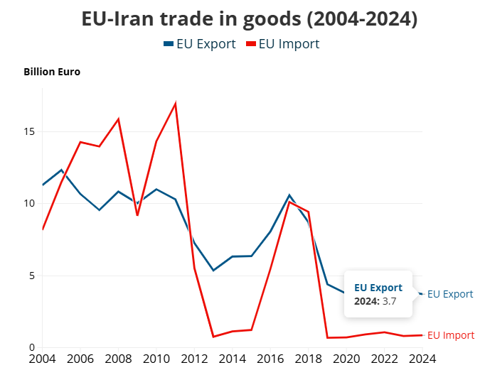 Deși UE a impus sancțiuni asupra Iranului încă din anul 2000, ca reacție la o serie de măsuri anunțate de Consiliul de Securitate al ONU în legătură cu porgramul nucelar al Teheranului, schimburile comerciale nu au fost întrerupte complet. Comerțul total de bunuri între Iran și UE a atins 4,6 mld. euro în 2024, importurile au avut o valoare de 850 mil. euro, în timp ce exporturile au însumat 3,7 mld. euro. Astfel, excedentul comercial rezultat a fost de 2,9 mld. euro în favoarea Uniunii Europene.