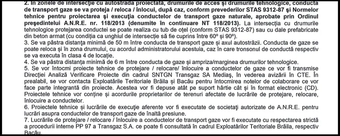 Avizul de amplasament prevede că lucrările de protejare / relocare / înlocuire a conductelor de transport gaze vor fi executate cu respectarea strictă a procedurii interne a Transgaz