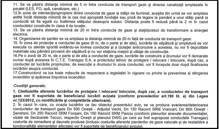 „În cazul în care, cu ocazia lucrărilor ce fac obiectul prezentului aviz, se va produce avarierea/deterioarea conductelor de transport gaze Dn 500 Onești – Adjudul Vechi, Dn 150 Racord SRM Vrancart, Dn 800 Onești – Șendreni, Dn 250 Racord SRM Focșani, Dn 150 Racord SRM Panciu (conform planurilor anexate documentației, vizate de Sectoarele Tecuci, respectiv Onești și planului DWG pe care au fost suprapuse conductele Transgaz) costurile de remediere și daunele produse (inclusiv costurile aferente pierderilor de gaze naturale și de restabilire a funcționalității elementelor afectate) vor fi suportate de beneficiarului avizului”, se arată în documentul consultat de Gândul.