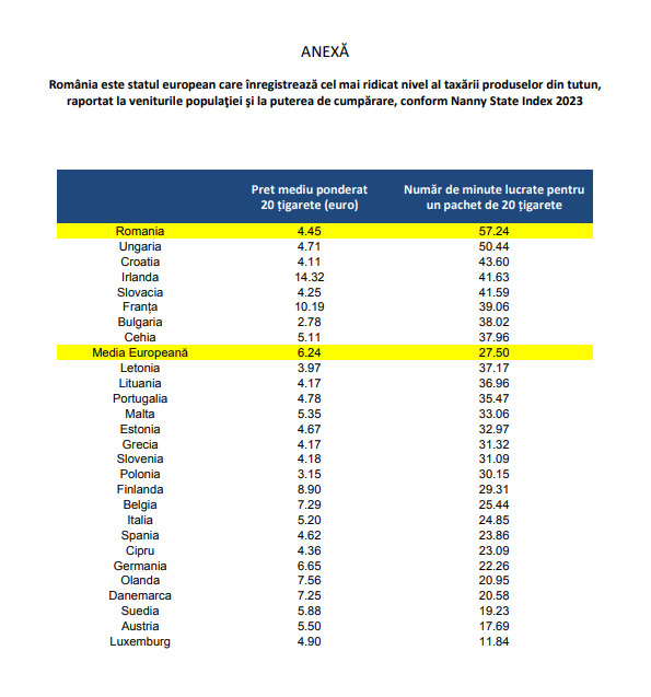 „Trebuie spus de la bun început că românii plătesc deja cele mai mari taxe aplicate produselor din tutun dacă se ține cont de puterea de cumpărare. Pentru a-și putea cumpăra un pachet de țigări, un român trebuie să lucreze de două ori mai mult decât cetățeanul european mediu, decât un grec sau decât un italian, de 3 ori mai mult decât un german sau un olandez și de 5 ori mai mult decât un luxemburghez”, spun producătorii, care au anexat un index de specialitate.