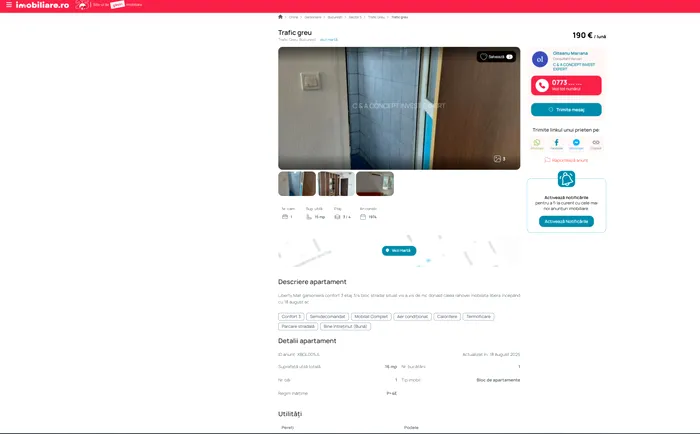 Iată un exemplu de apartament de confort 3, cu o suprafață 15 metri pătrați din cartierul Ferentari, care poate fi închiriat pentru suma de 190 euro lunar, într-un bloc construit din 1974. Chiria este acceptabilă pentru un român cu salariul minim net pe economie. Însă, traficul rutier din zonă este aglomerat.