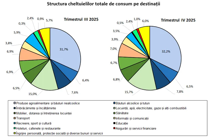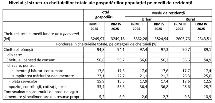 Au crescut însă și cheltuielile. Cheltuielile totale medii lunare ale populației au fost în trimestrul IV din 2025, în termeni nominali, de 8075 lei pe o gospodărie, adică 3249 lei pe o persoană, și au reprezentat 85,4% din veniturile totale, în scădere cu 4 lei pe o gospodărie față de trimestrul III 2025. Comparativ cu trimestrul IV al anului precedent, cheltuielile totale medii lunare pe o gospodărie au crescut cu 11,0%, iar cele pe o persoană au crescut cu 11,7%.
