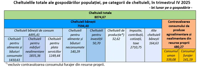 În trimestrul IV 2025, principalele destinaţii ale cheltuielilor efectuate de gospodării sunt consumul (cheltuielile băneşti de consum şi contravaloarea consumului uman din resurse proprii) de 4834 lei lunar pe o gospodărie (59,9%) şi transferurile către administraţia publică şi către fondurile publice şi private de asigurări sociale, sub forma impozitelor, contribuţiilor, cotizaţiilor, taxelor de 2.711 lei pe o gospodărie (33,6%).