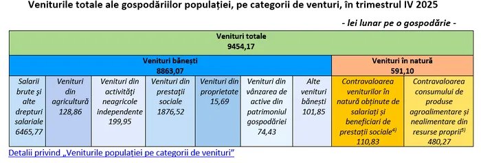 Conform datelor publicate de INS, în trimestrul IV al anului 2025, veniturile bănești medii lunare au fost de 8.863 lei lunar pe o gospodărie, ceea ce înseamnă 3.566 lei pe o persoană, în scădere cu 0,2% față de trimestrul anterior. Salariile brute și alte drepturi salariale au fost de 6.466 lei lunar pe o gospodărie și au format 68,4% din veniturile totale ale gospodăriilor.