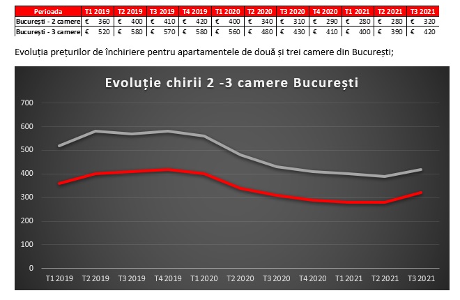 Potrivit datelor Investpoint, prețul chiriilor din București, ȋn T3 2021, este ȋncă la o diferență considerabilă, ȋn minus, față de aceeași perioadă a lui 2019, ȋnainte de ȋnceperea crizei sanitare – 22%. Apartamentele de două și trei camere, se ȋnchiriau, ȋn medie, cu 410 euro, respectiv 570 euro, ȋn urmă cu doi ani, față de 320 euro, respectiv 420 euro, ȋn prezent.