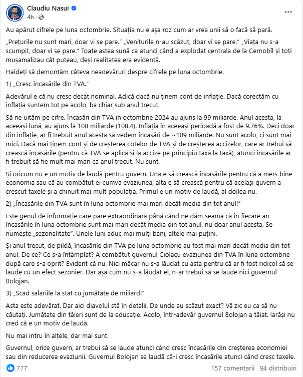 Și oricum nu e un motiv de laudă pentru guvern. Una e să crească încasările pentru că a mers bine economia sau că au combătut ei cumva evaziunea, alta e să crească pentru că același guvern a crescut taxele și a chinuit mai mult populația. Primul e un motiv de laudă, al doilea nu.”, a explicat Năsui.