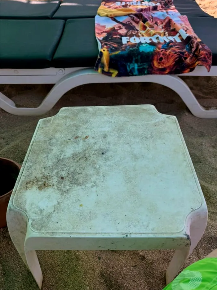 Turiștii pățiți au postat și câteva fotografii cu mobilierul murdar din apartament și șezlongurile neglijate de pe plajă.