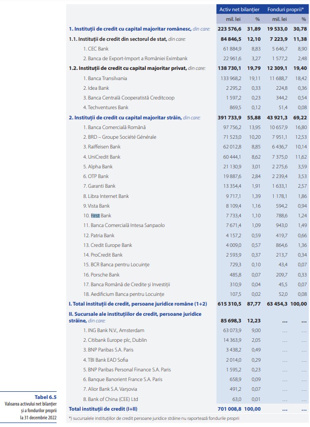 Numărul instituțiilor de credit care activau atunci în România se redusese pe parcursul anului 2022, de la 34 la 32 de instituții de credit, modificările intervenite fiind determinate de: