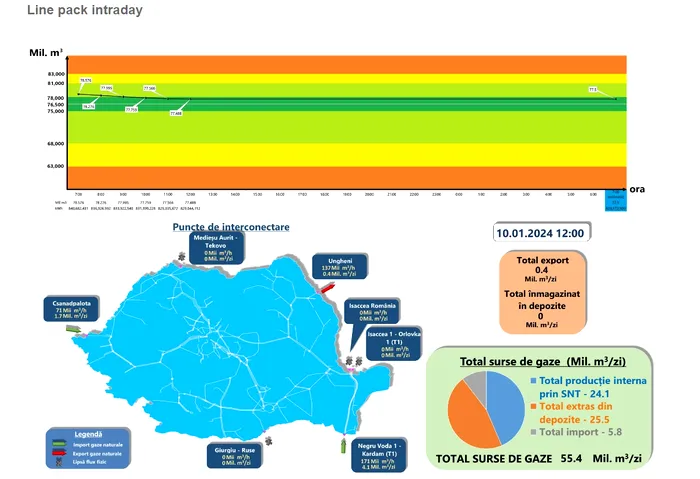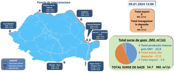 Marți, producția internă era de 23,9 milioane de metri cubi de gaze, iar importurile erau de 3,8 milioane de metri cubi de gaze, care au intrat exclusiv din Bulgaria, prin punctul de interconectare Negru Vodă. Din depozite se extrăsese o cantitate de 27 milioane de metri cubi de gaze.