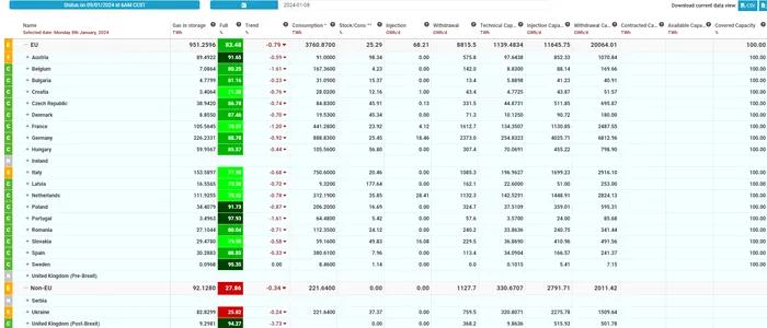 În acest an s-a înregistrat maximul istoric al depozitării gazelor, conform graficelor GIE, care au pornit la 2 ianuarie 2012. La acel moment, avea în depozite 16,96 TWh și o capacitate totală de stocare de 31,41TWh.
