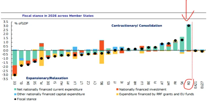 De altfel, datele Comisiei Europene arată faptul că România va efectua în anul 2026 cea mai dură ajustare a deficitului bugetar, preponderent pe seama reducerii cheltuielilor publice. (Infografic 3)