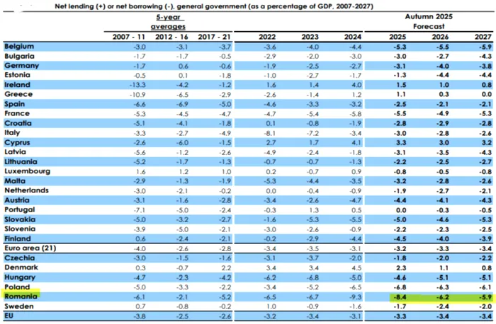 Analiza comparativă la nivelul țărilor UE 27, pe baza datelor prognozei Comisiei Europene, arată că dacă în 2025 România va avea cea mai mare pondere a deficitului bugetar efectiv în PIB (8,4% din PIB), peste Polonia (6,8% din PIB) și Franța (5,5% din PIB), anul viitor Polonia va fi țara UE cu cel mai mare deficit (6,3% din PIB), peste România (cu 6,2% din PIB) și Belgia (5,5% din PIB). Acest clasament se va păstra și în anul 2027.