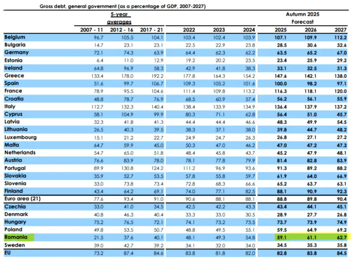 Analiza la nivelul UE27 arată că există 12 țări cu ponderea datoriei guvernamentale brute peste nivelul de 60% din PIB, cu derapaje substanțiale în Grecia (148% din PIB), Italia (136% din PIB), Franța (116% din PIB), Belgia (107% din PIB) și Spania (100% din PIB).