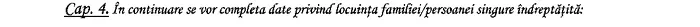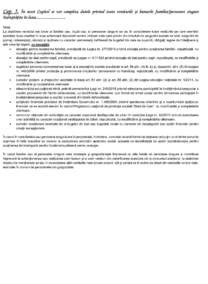(4) În cererea și declarația pe propria răspundere solicitantul ajutorului pentru încălzire și al suplimentului pentru energie prevăzute la art. 1 are obligația de a menționa componența familiei, veniturile realizate, elementele de identificare a furnizorului, codul de client și locul de consum, bunurile aflate în proprietate, închiriere, concesiune, comodat sau altă formă de deținere, cuprinse în lista bunurilor ce conduc la excluderea acordării ajutorului pentru încălzirea locuinței. Persoanele care solicită ajutorul pentru energie termică au obligația de a completa numărul de camere ale locuinței.
