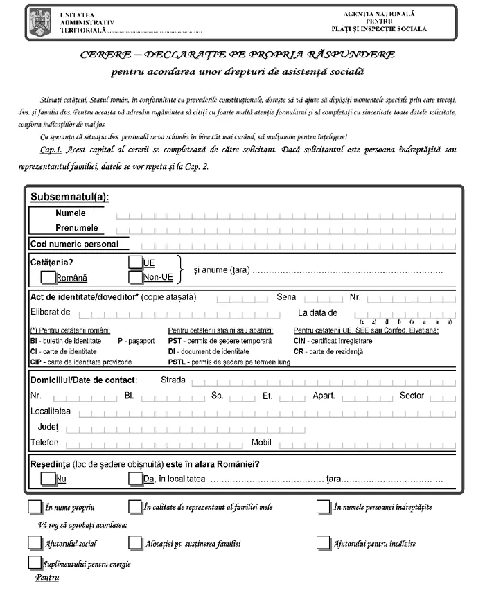 Formularul de cerere și declarație pe propria răspundere va fi pus la dispoziția solicitanților și în format electronic, pe site-ul autorității administrației publice locale, precum și pe site-urile agențiilor județene pentru plăti și inspecție socială, respectiv a municipiului București, denumite în continuare agenții teritoriale.