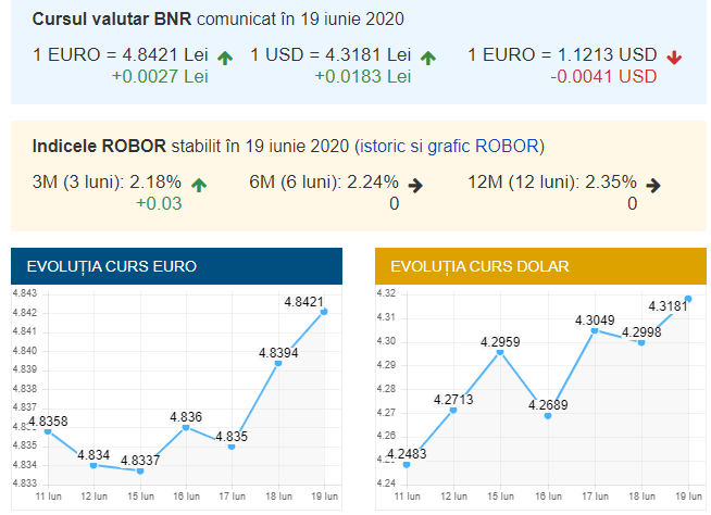 Maximul istoric înregistrat de euro în raport cu leul, de 4,8448 lei/euro, a fost atins pe 17 martie 2020. Cursul mediu al BNR pentru euro aferent lunii mai 2020 a fost de 4,8365 lei pe unitate.