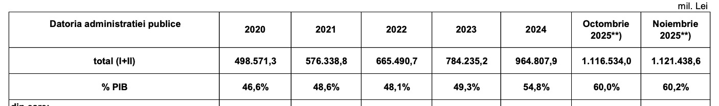 Ministerul Finanțelor a publicat, luni, rapoartele despre datoria publică în lunile octombrie și noiembrie. Cifrele arată că guvernul Bolojan a adăugat 81 mld. lei la datoria publică, de când a preluat mandatul. Datoria publică totala la final de noiembrie era de 1.121 mld lei, pe când, la final de iunie 2025, era de 1.040 mld. lei. Practic, abia acum a ieșit la iveală că datoria României a spart pragul de 60% din PIB încă din octombrie 2025.