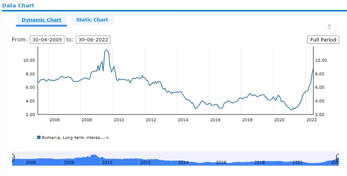Costul dobânzilor pentru împrumuturi pe termen lung a ajuns, în iunie 2022, la 8,74%, după ce cu o lună înainte, în mai 2022, era sub pragul de 8%, respectiv 7,84%, iar cu o lună și mai devreme, sub cel de 7%, respectiv de 6,61%, în aprilie 2022. În prima lună a anului curent, valoarea era de 5,37%, în timp ce în ianuarie 2021 era de 2,72%.
