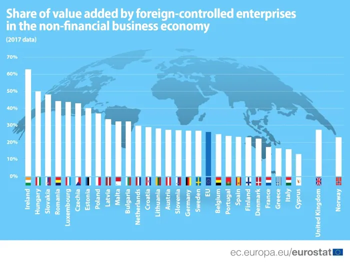 Chiar dacă în 2017 doar 1,3% din companiile din UE erau controlate de o firmă străină, acestea realizau 26% din valoarea adăugată în sectorul non-financiar din Uniune!