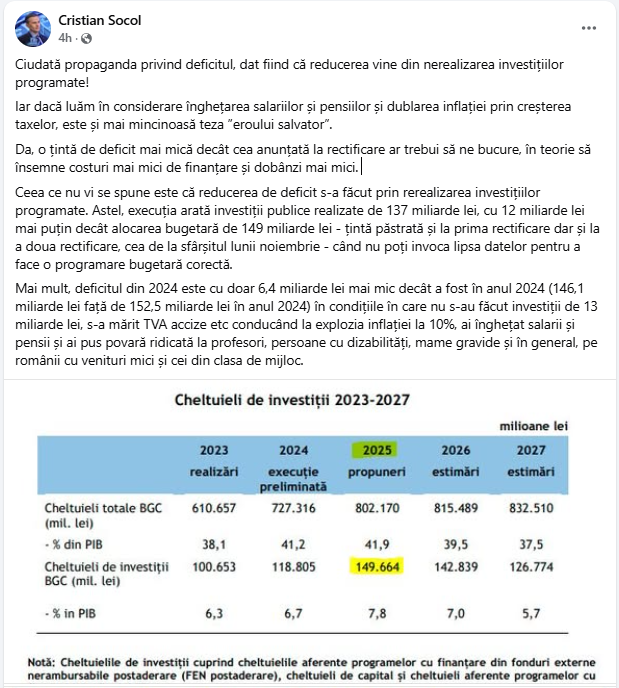 Economistul Cristian Socol avertizează prin intermediul unei postări pe rețelele de socializare că reducerea deficitului bugetar din 2025 față de 2024 a fost obținută prin scăderea investițiilor programate decât prin creșterea eficienței. Anomalia observată de specialist a fost semnalată de Gândul în urmă cu trei săptămâni.