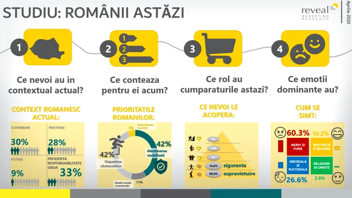 „Situația de instabilitate în care ne aflăm provoacă brandurile să se alinieze în comunicare cu așteptările consumatorilor. Principalul motiv pentru care am decis să livrăm partenerilor noștri insight-uri despre prioritățile și emoțiile românilor este să-i ajutăm să fie mereu conectați la nevoile publicului lor țintă, să vorbească pe aceeași limbă și să ia decizii potrivite și compatibile cu starea de spirit a românilor” , a adăugat Marius Luican, Director General Reveal Marketing Research.