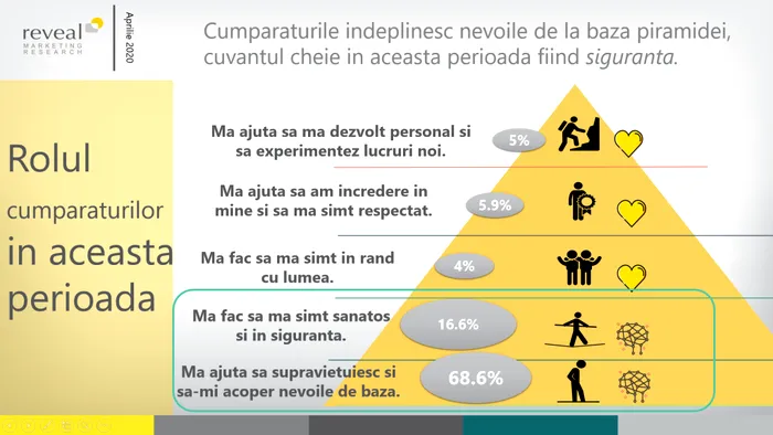 Defalcat, 68,6 la sută dintre respondenți susțin că achizițiile din această perioadă „îi ajută să supraviețuiască și să-și acopere nevoie de bază”. Pentru 16,6% dintre intervievați, cumpărături pe timp de pandemie „îi fac să se simtă sănătoși și în siguranță”, iar 4 procente mărturisesc că achizițiile realizată în această perioadă îi determină pe respondenți „să se simtă în rând cu lumea”.