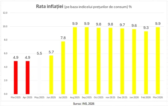 Așa cum indică evoluția indicelui prețurilor de consum, rata inflației s-a dublat în doar câteva luni, urcând de la 4,9% în primăvara anului trecut la un alarmant 9,9% în martie 2026. Această explozie a prețurilor nu este un accident de parcurs, ci consecința directă a creșterilor abrupte de taxe, în special majorarea TVA-ului și a accizelor.