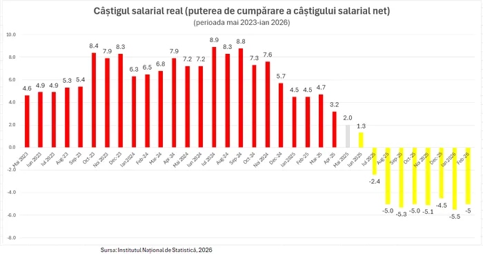 Graficul câștigului salarial real arată o prăbușire fără precedent. După o perioadă de susținere a veniturilor (n.r. până în mai 2025), puterea de cumpărare a intrat într-un declin abrupt, trecând rapid pe minus. Astăzi vorbim despre 8 luni de scădere consecutivă a valorii reale a muncii românilor.