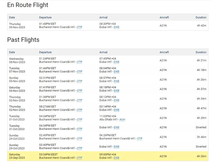 Graficul de zbor al companiei aviatice low-cost Wizz Air consultat de Gândul arată că, după incidentul din 29 octombrie, când peste 200 de pasageri care voiau să ajungă în Dubai au fost întorși la Otopeni după două ore de la decolare, o a doua cursă a ratat de asemenea aterizarea la destinația oficială. Cursele au fost continuate, deși compania cu sediul la Budapesta invoca inițial că „un aspect ce ține de reglementare” a fost motivul pentru care responsabilii aeroportului din Dubai au refuzat să permită aterizarea aeronavei operate de Wizz Air. La solicitarea Gândul, responsabilii din Emiratele Arabe Unite au transmis pozițiile lor oficiale cu privire la misterul din jurul zborului de acum aproape două săptămâni.
