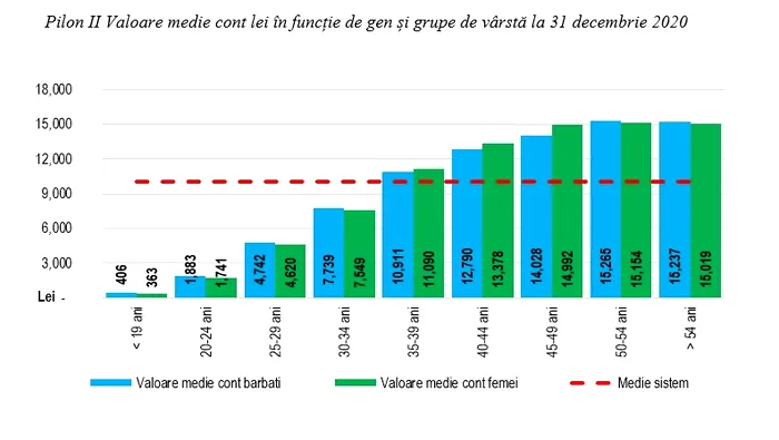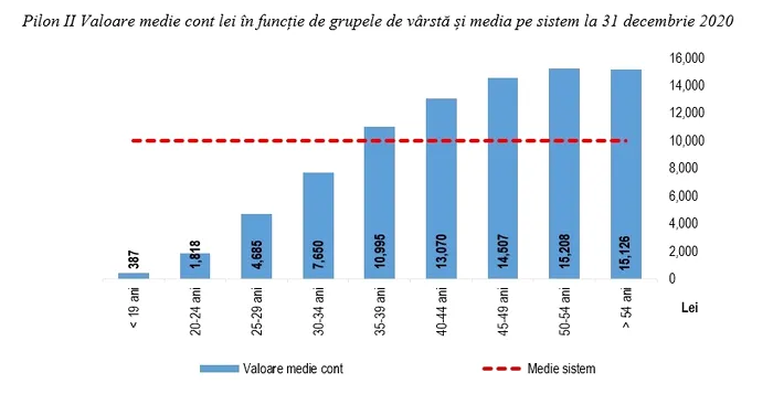 Astfel, dacă este luată în calcul doar grupa de vârstă, cea mai mare valoare medie a unui cont, la 31 decembrie, este de 15.208 de lei, pentru categoria de vârstă de 50 – 54 de ani. La extremele de vârstă, cei cu vârste de sub 19 ani au strâns în cont în medie 387 de lei, în timp ce cei care au trecut de 54 de ani au, în medie, 15.126 de lei în cont. Media pe sistem, de 9.988 de lei, este depășită începând de la categoria de vârstă de 35-39 de ani, cu un cont mediu de 10.995 de lei.