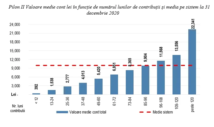 Dacă este luată în calcul strict vechimea în sistem, un român care a contribuit sub un an are, în medie, 392 de lei în cont, în timp ce participantul cu peste 10 ani (120 de luni) de contribuții a acumulat, în medie, 22.341 de lei.