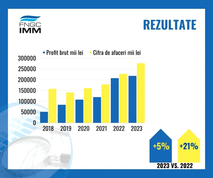 Potrivit oficialilor, echipa FNGCIMM a intensificat anul trecut ritmul de creștere trasat în orizontul 2019 – 2022, astfel încât în ultima zi a anului Fondul a înregistrat un salt substanțial raportat la realizările anului 2022, consemnând la finele anului 2023 un nivel al cifrei de afaceri de 276,33 milioane de lei, în creștere substanțială (+21%) față de nivelul înregistrat în anul 2022 (227,63 milioane de lei).