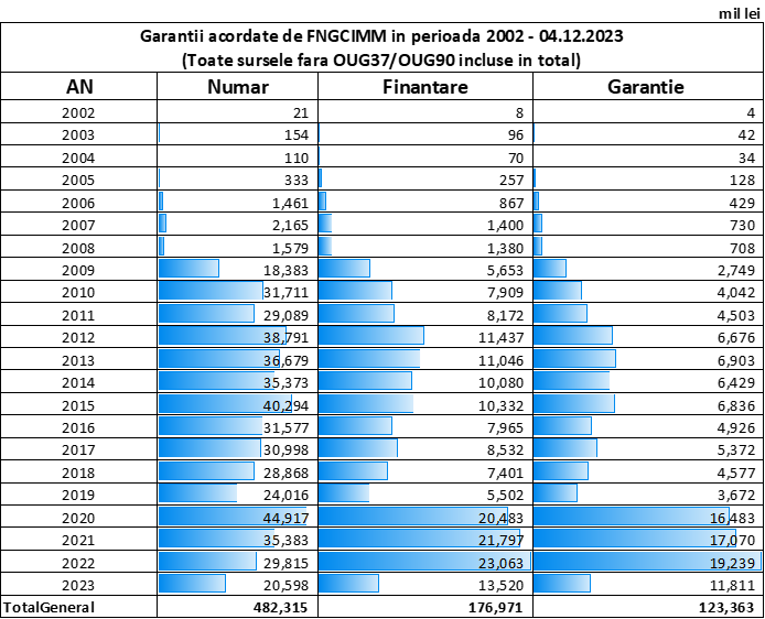 Din 2002 până la data de 04.12.2023, FNGCIMM a ajutat 482.315 de IMM-uri, care au accesat finanțări totale de 176,97 ,milioane de lei, garanțiile ajungând la 123,36 milioane de lei.