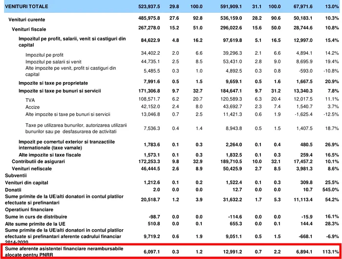 Pe 31 iulie 2025, ministrul Investițiilor și Proiectelor Europene, Dragoș Pîslaru, anunța că România a finalizat negocierea PNRR și că cel puțin 7 mld. euro vor fi trecute de la componenta de împrumuturi din PNRR, la componenta granturi din f0nduri de coeziune. Acesta a fost momentul în care se știa deja – sau ar fi trebuit să se știe – că o parte din aceste fonduri vor fi înregistrate și la venituri. Practic, aceste fonduri pierdute ar fi urmat să se regăsească în cheltuielile statului dar, atunci când acestea trec de la PNRR la fondurile de coeziune , la granturi, în execuția bugetară se vor regăsi atât la venituri, cât și la cheltuieli.