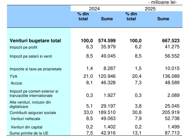 Când vine vorba de impozitul pe profit, sumele sunt egale cu cele din Strategia fiscal bugetară prezentată la începutul lui 2025, iar la capitolul impozit pe venit, încasările au crescut cu 2 mld. lei. Așadar, Finanțele au adunat din impozitul pe salarii și venit 59 mld. lei, față de 57 mld. lei cât era estimat la începutul anului. La capitolul TVA, încasările au fost mai mici cu 2 mld. lei decât cele prognozate deși TVA-ul a crescut de la 1 august 2025 de la 19% la 21%. În cazul accizelor, s-a întâmplat același lucru iar încasările au fost mai mici cu 1 mld. lei decât cele din proiecția inițială a Guvernului. În schimb, contribuțiile de la CAS au fost mai mari cu 2 mld. lei decât cele estimate, astfel că contribuțiile de asigurări au fost în total 208 mld. lei, în loc de 206 mld. lei. De asemenea, veniturile nefiscale au fost mai mari cu 1 mld. lei decât prognoza Guvernul.
