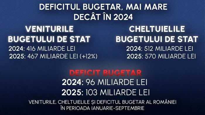 Datele analizate de Gândul arată că veniturile la buget ar fi fost de 467 miliarde de lei, iar cheltuielile de 570 miliarde lei, în primele 9 luni ale anului. În consecință, deficitul bugetar ar fi ajuns la 103 miliarde lei (20 mld. euro).