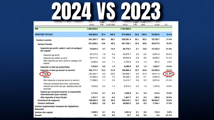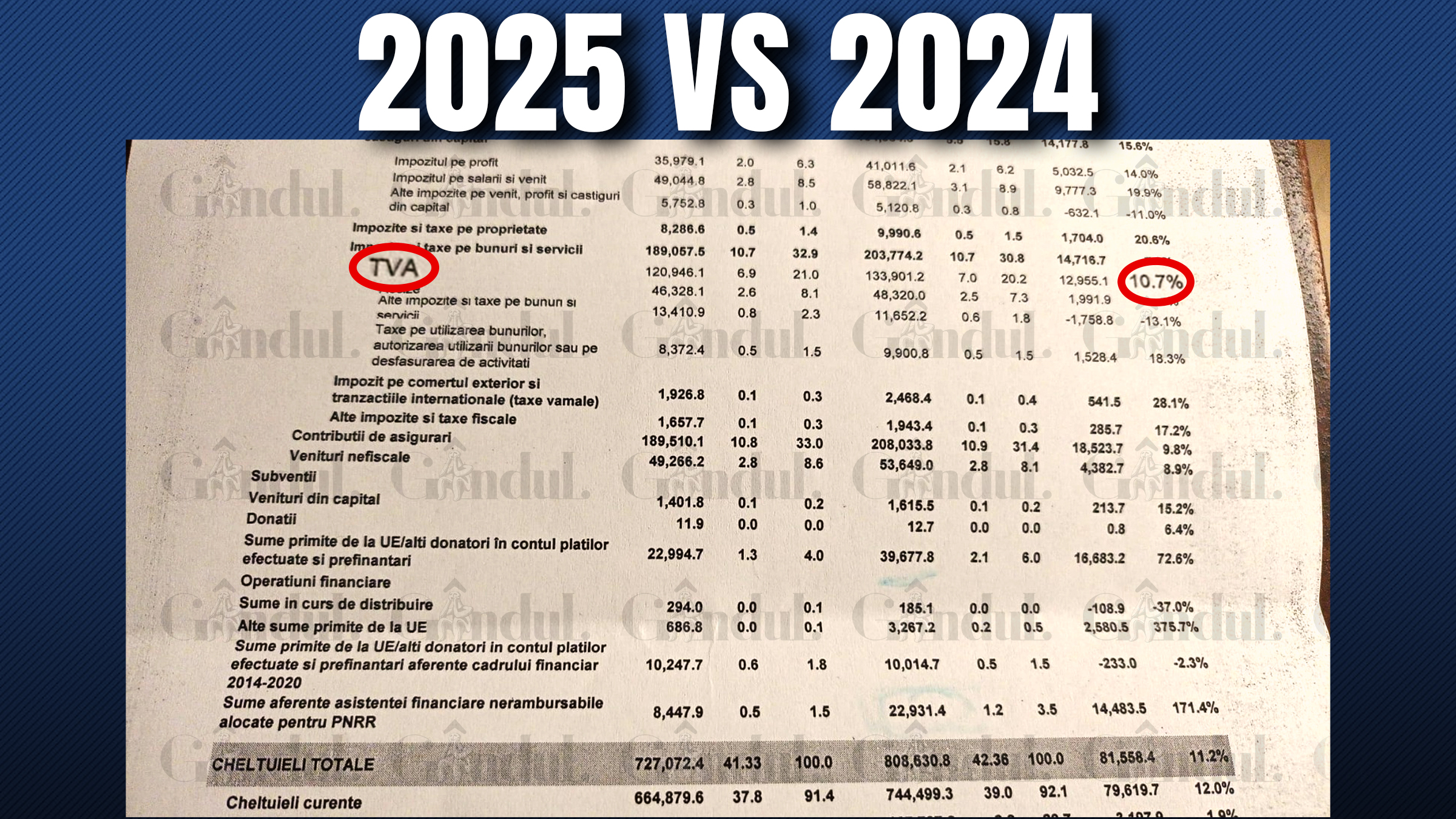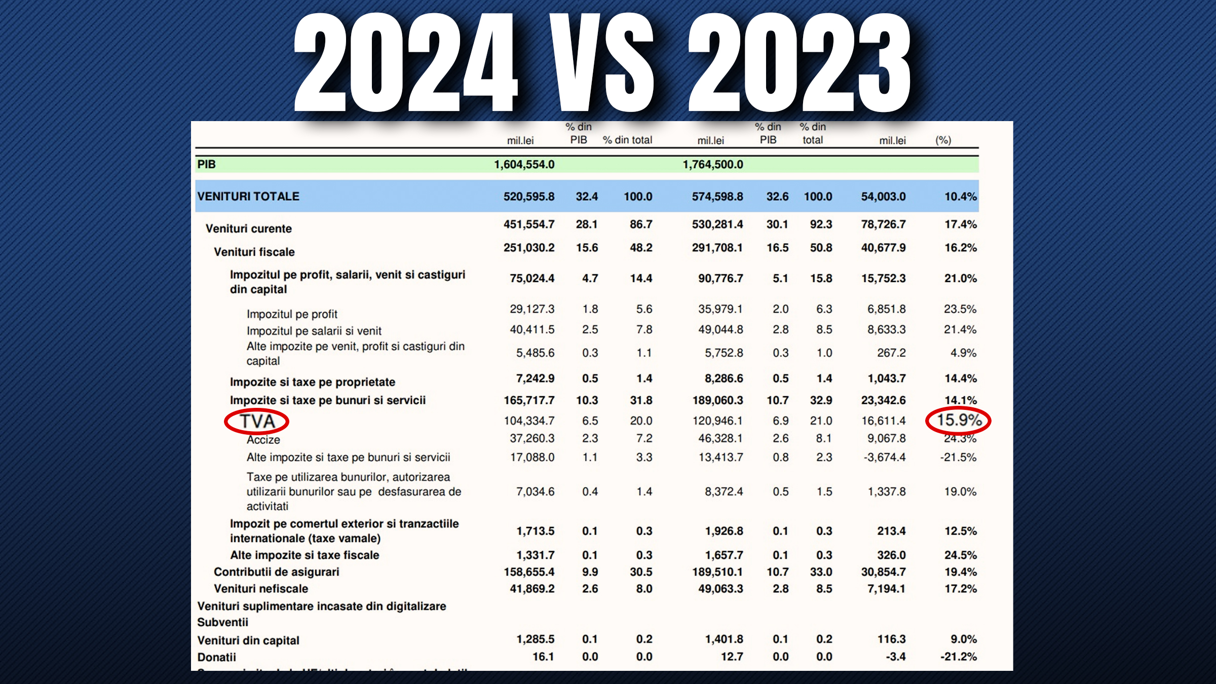 Spre comparație, în 2024, fără creștere de TVA, guvernul a încasat cu 16% mai mult, așa cum arată documentele publicate de Ministerul de Finanțe cu privire la execuția bugetară. Cu toate acestea, inflația a fost la jumătate, 5%, iar consumul a înregistrat o creștere de aproape 9%, aproape de vremurile economice bune.